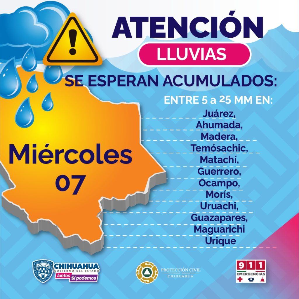 Asimismo se espera que hoy continúe el pronóstico de lluvias en Juárez, Ahumada, Madera, Temósachic, Matachí, Guerrero, Ocampo, Morís, Uruachi, Guazapares, Maguarichi y Urique, con posible acumulado de 5.1 a 25 milímetros (mm).