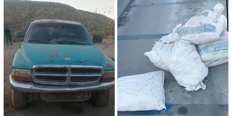 Tras percatarse de la proximidad policial, las personas reportadas huyeron con rumbo desconocido a bordo de un automotor y dejaron abandonada en el lugar una pick up de la marca Dodge, línea Dakota, de color verde y seis costales de color blanco que contenían dos mil 720 kilogramos de mineral que pretendían sustraer.