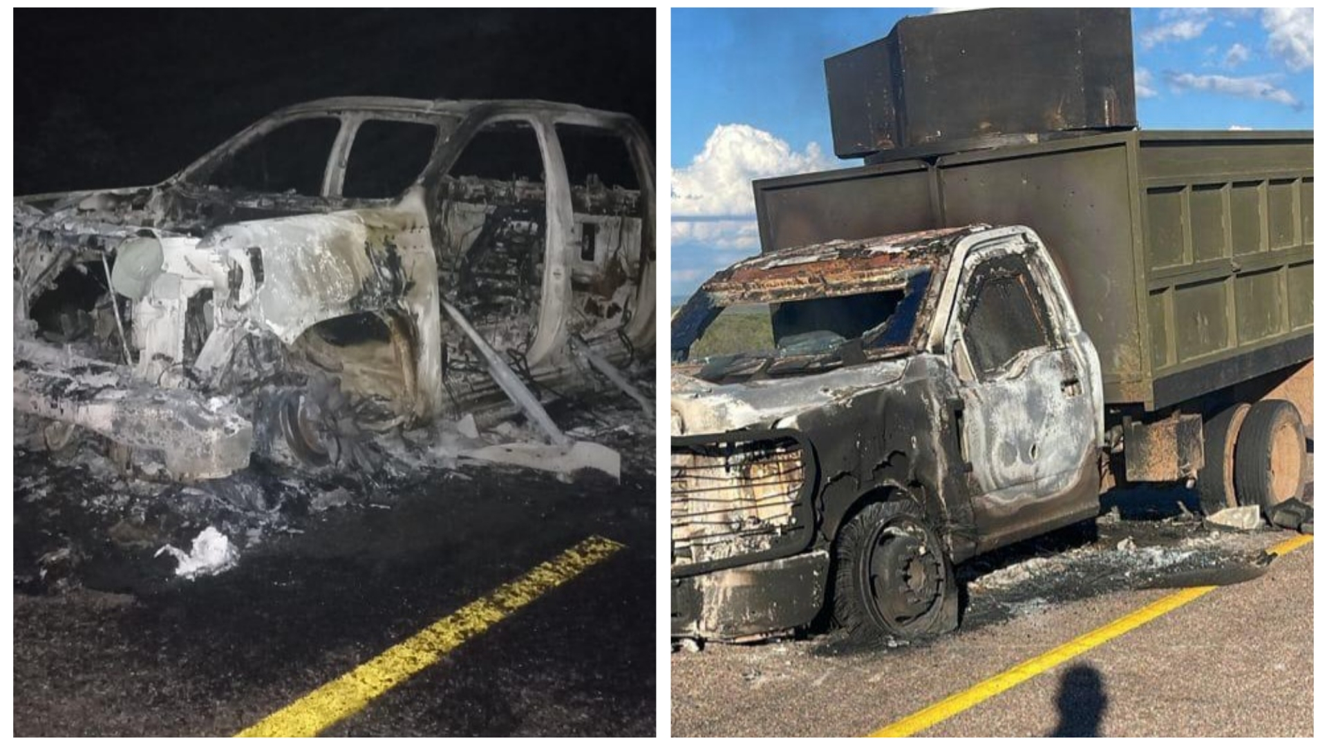 La tarde y noche del lunes 16 de septiembre, las Bases de Operación Interinstitucional (BOI), atendieron reportes sobre la localización de dos vehículos con daños por incendio, en diversos puntos de la carretera que conduce del municipio de Coronado a Valle de Allende.