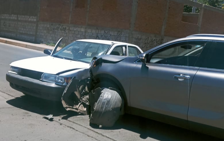 Agentes de Vialidad tomaron nota del percance en el que una KIA Sorento impactó de manera frontal a un Nissan Tsuru habilitado como carro de sitio con número económico 202, dejando el encontronazo cuantiosos daños materiales en ambos automotores.