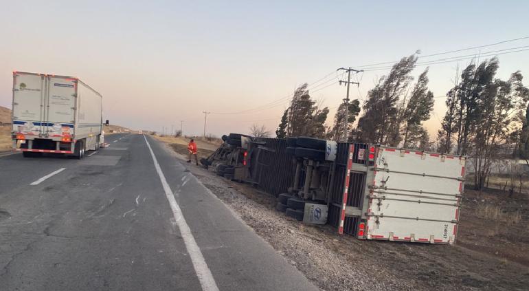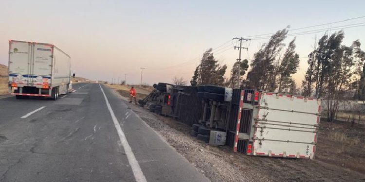 Un tráiler volcó a la altura del kilómetro 81 de la carretera Chihuahua-Ciudad Juárez, a causa de los fuertes vientos registrados en la entidad.