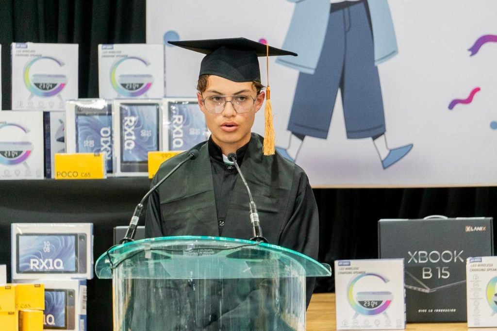 A nombre de las y los participantes, José Miguel Méndez Hidalgo, alumno del CECyTECH No.18 de Aldama, brindó unas palabras de agradecimiento a la gobernadora Maru Campos por el impulso a este programa, que incentiva y reconoce la excelencia académica de las y los estudiantes chihuahuenses.