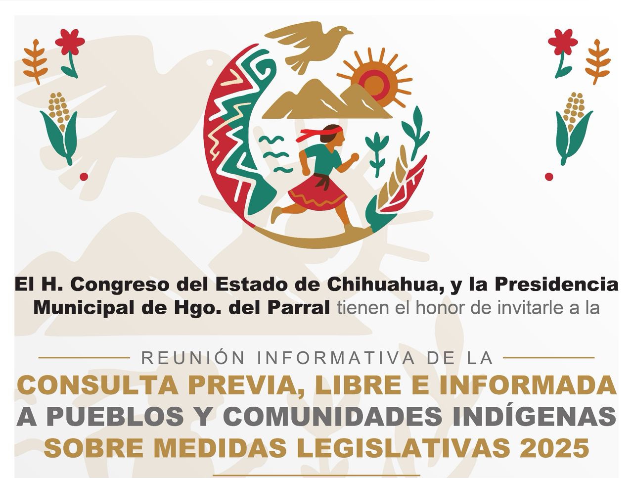 El Gobierno de Parral, en coordinación con el Honorable Congreso del Estado de Chihuahua, convoca a la Consulta Previa, Libre e Informada a Pueblos y Comunidades Indígenas sobre Medidas Legislativas 2025, un ejercicio de participación que busca garantizar que las voces de los pueblos originarios, sean escuchadas, respetadas e incorporadas en el proceso legislativo.