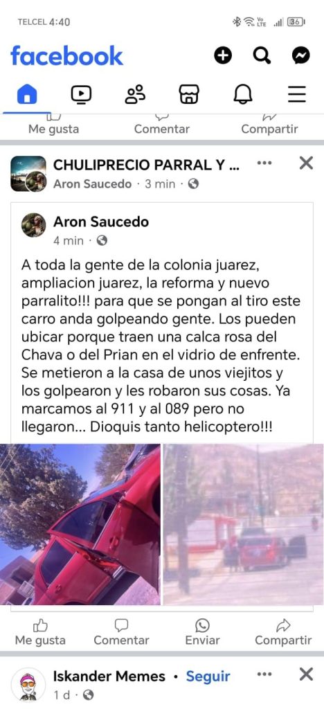En redes sociales, denunciaron al sedán rojo por andar «golpeando gente» por el sector de las colonias Juárez, Reforma y Nuevo Parralito.
