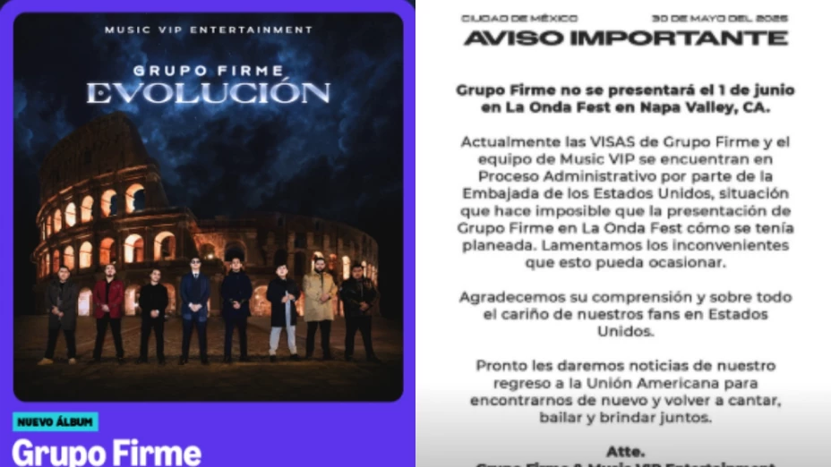 En un comunicado publicado en sus redes sociales explicaron que: “Actualmente las visas de Grupo Firme y el equipo de Music VIP se encuentran en Proceso Administrativo por parte de la Embajada de Estados Unidos”, por lo que la presentación de Grupo Firme en La Onda Fest tendrá que ser reagendada.