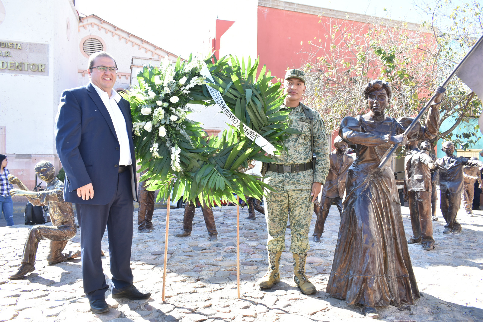 El alcalde de Parral, Salvador Calderón, encabezó la Guardia de Honor que se montó en el monumento dedicado a Elisa Griensen Zambrano frente a la Escuela Primaria 8 de Mayo No. 2099.