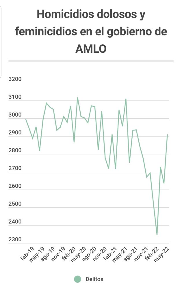 Aún con la Guardia Nacional desplegada por todo el país, los datos de violencia no han tenido una reducción. De acuerdo con cifras del Secretariado Ejecutivo del Sistema Nacional de Seguridad, en los primeros 42 meses del gobierno de Andrés Manuel López Obrador suman 121,655 homicidios dolosos y feminicidios, cifra mayor a los 120,463 muertes violentas que ocurrieron durante el sexenio del panista Felipe Calderón. Esta administración se perfila a ser la más violenta de la historia de México.