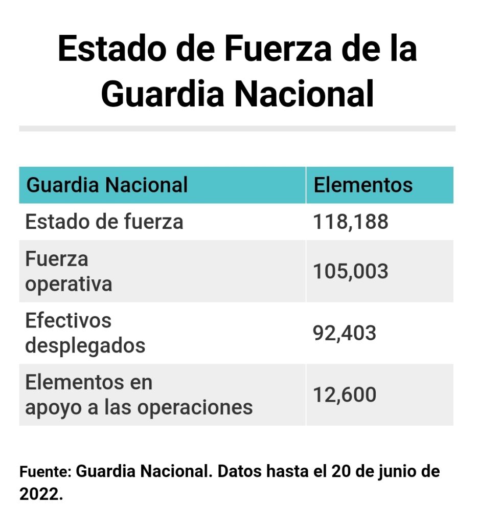 El 30 de junio de 2019, la Guardia Nacional inició su despliegue con 70,000 elementos. El propósito de la corporación naciente sería cubrir 266 regiones con 150,000 efectivos. Hoy su fuerza operativa es de 118,188, de los que 92,403 están desplegados en todo el país.