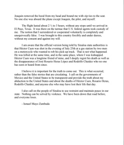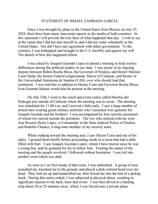 En una declaración por escrito difundida por su defensa, Zambada confirmó que no se entregó voluntariamente a autoridades estadounidenses, sino que Joaquín Guzmán López, hijo de Joaquín Guzmán Loera, participó en una trampa para capturarlo.