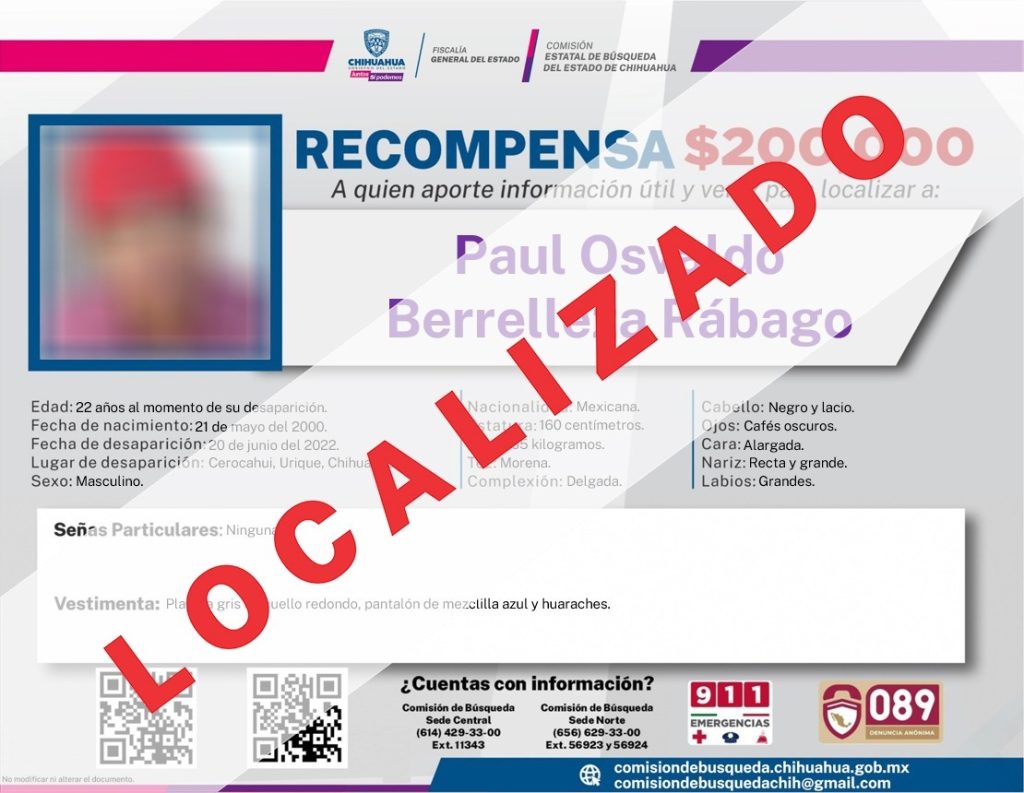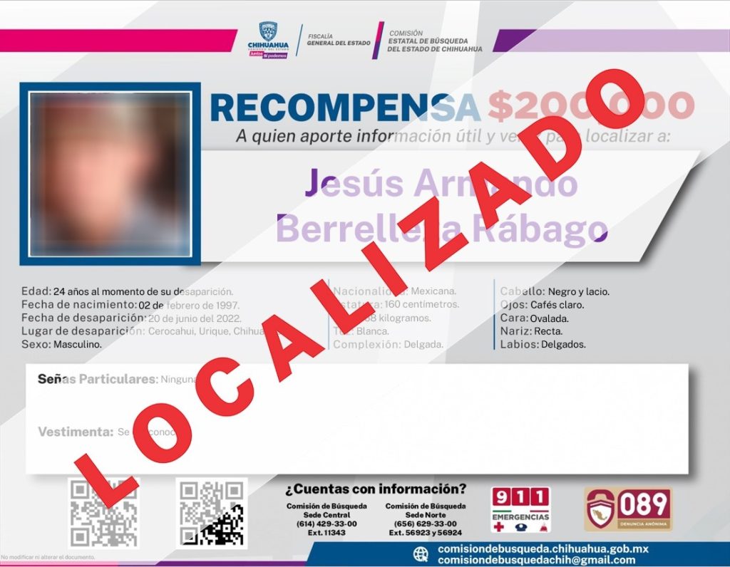 “Como resultado de los operativos conjuntos implementados en la zona serrana, en los que participan la Secretaría de la Defensa Nacional, Guardia Nacional, Secretaría de Seguridad Pública del Estado y la Fiscalía General del Estado de Chihuahua, se logró localizar a los hermanos Berrelleza Rábago, quienes habían sido vistos por última vez el 20 de junio en la comunidad de Cerocahui, municipio de Urique”, informó la Fiscalía en un comunicado.