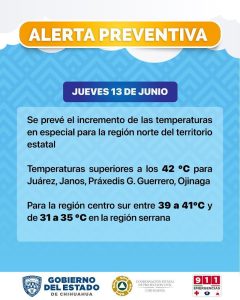La dependencia prevé un ambiente cálido por la mañana y caluroso a muy caluroso por la tarde, con temperaturas superiores a los 42 grados centígrados (°C) en Juárez, Ojinaga y Chínipas para esta tarde de jueves.
