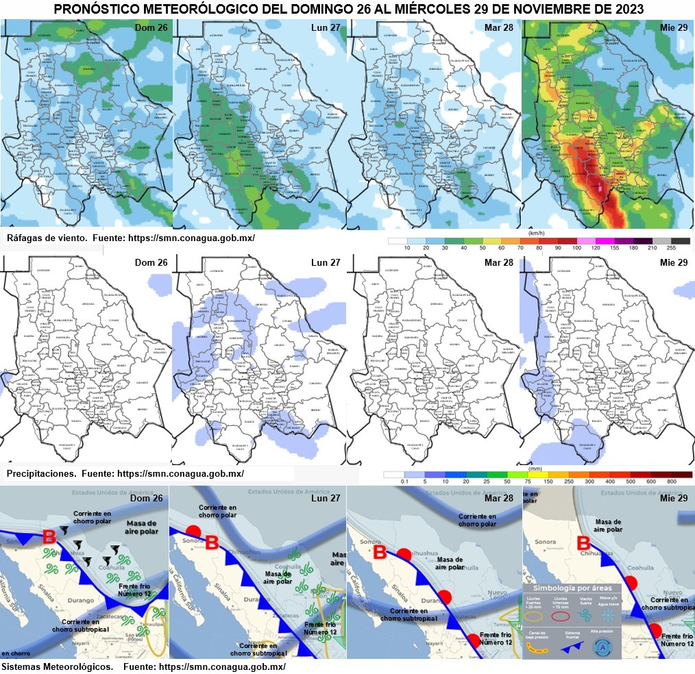 Con base en la información emitida por el Sistema Meteorológico Nacional, se esperan vientos de 5 a 20 kilómetros por hora (km/h), con rachas que pueden alcanzar los 55 km/h en la zona suroeste del estado que incluye a Balleza, donde se podrían presentar tolvaneras, y los 45 km/h en municipios como Guachochi, Guadalupe y Calvo, Nonoava y Satevó.