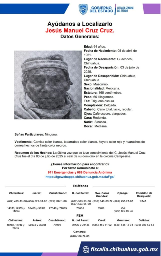 La Fiscalía General del Estado emitió una pesquisa para dar con el paradero de Jesús Manuel Cruz Cruz, un hombre de 64 años originario de Guachochi, quien fue visto por última vez el pasado 3 de julio de 2025, tras salir de su domicilio ubicado en la colonia Campesina, en la ciudad de Chihuahua.