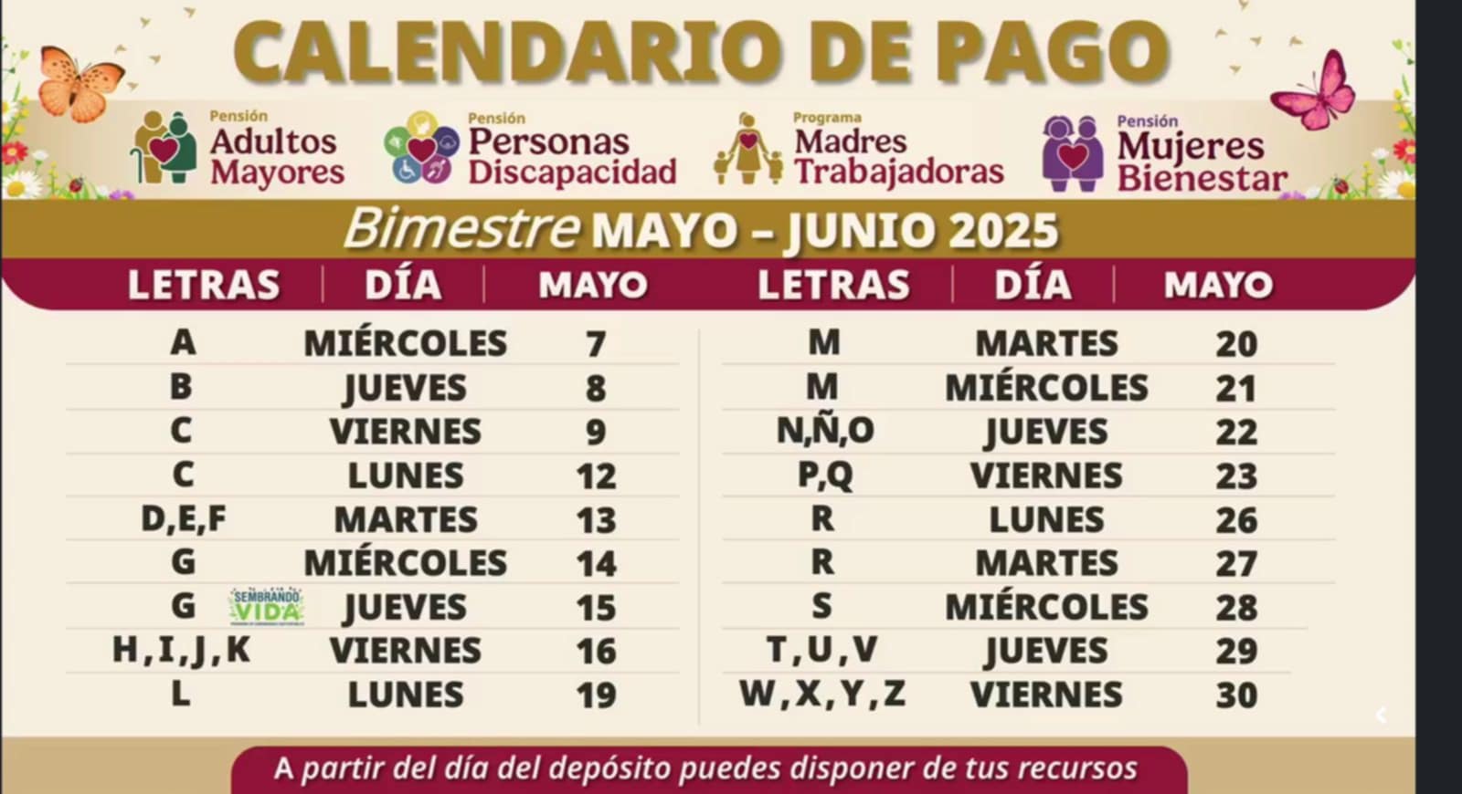Este calendario de pagos aplica también para la Pensión Mujeres Bienestar -—que tiene 1.1 millón de beneficiarias y cuyo nuevo registro abre en agosto—; Pensión para personas con discapacidad; Programa para Madres Trabajadoras, y Sembrando Vida.