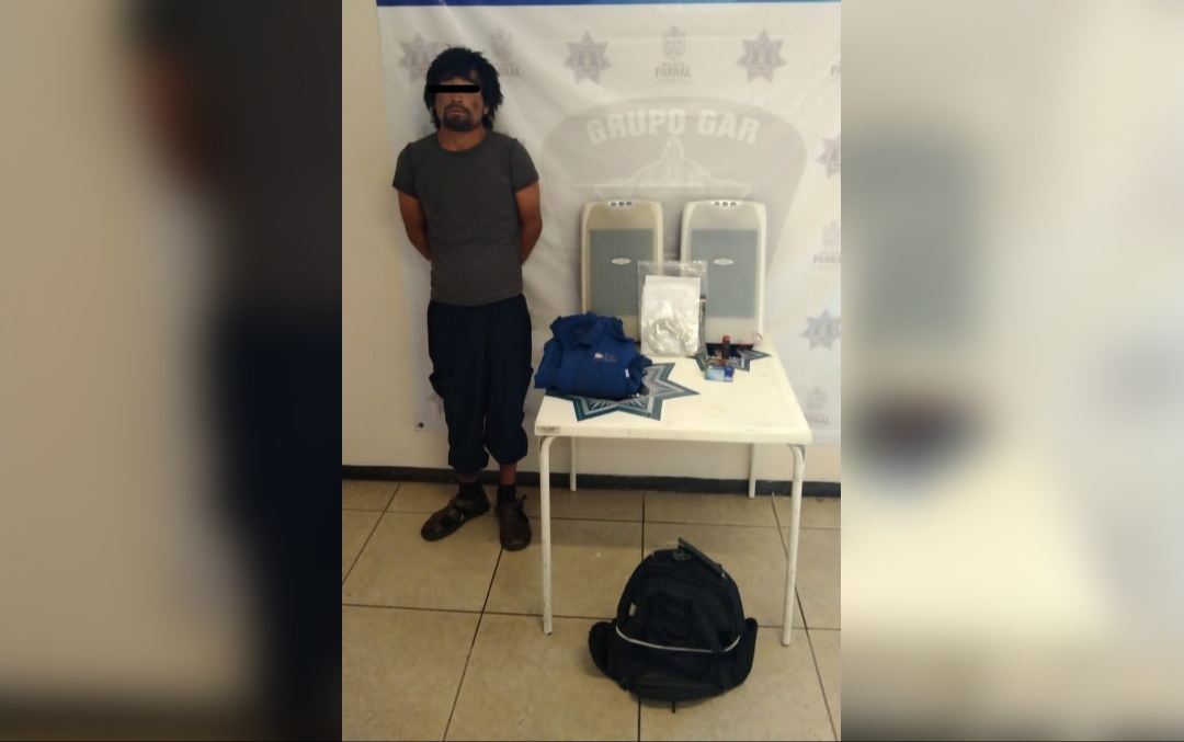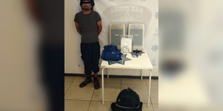 Agentes de la Dirección General de Seguridad Pública Municipal incorporados al Grupo Especial de Atención a Robos arrestaron a un individuo luego de que fuera sorprendido ocultándose de la autoridad policiaca y mientras cargaba con objetos que finalmente no logró comprobar su procedencia.