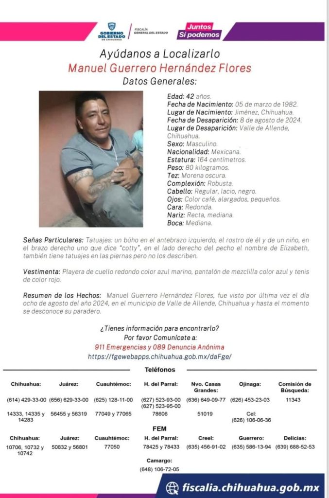 El hoy occiso fue identificado como Manuel Guerrero H.F., de 42 años de edad, quien contaba con reporte de desaparición interpuesto ayer jueves 15 de agosto, por hechos ocurridos el día 08 de agosto del año en curso en el referido municipio.