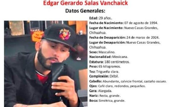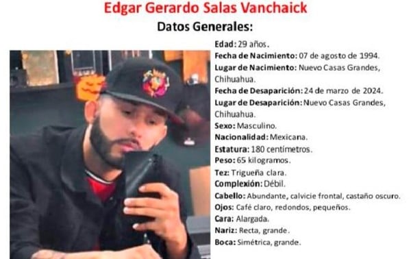 Dicha persona respondía al nombre de Edgar Gerardo S. V., tenía de 29 años de edad, era originario de la ciudad de Nuevo Casas Grandes, y contaba con reporte de desaparición interpuesto el día 24 de marzo de 2024.