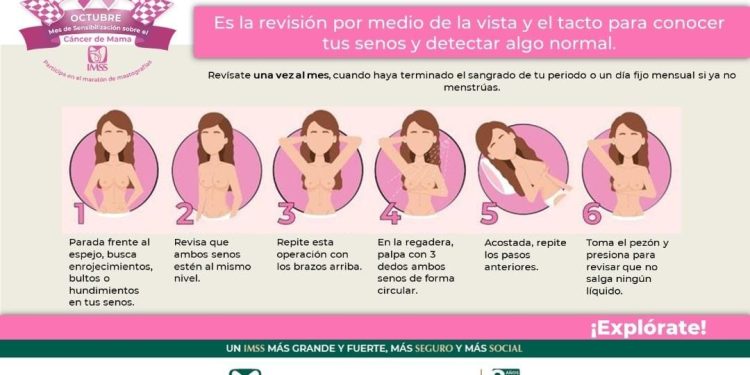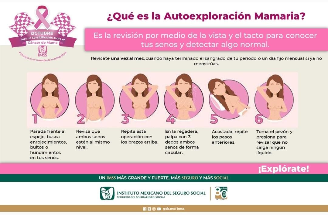 El Instituto Mexicano del Seguro Social, a través de la Jefatura de Prestaciones Médicas, exhorta a las mujeres a realizarse la autoexploración de senos para detectar y atender de manera oportuna cáncer de mama.