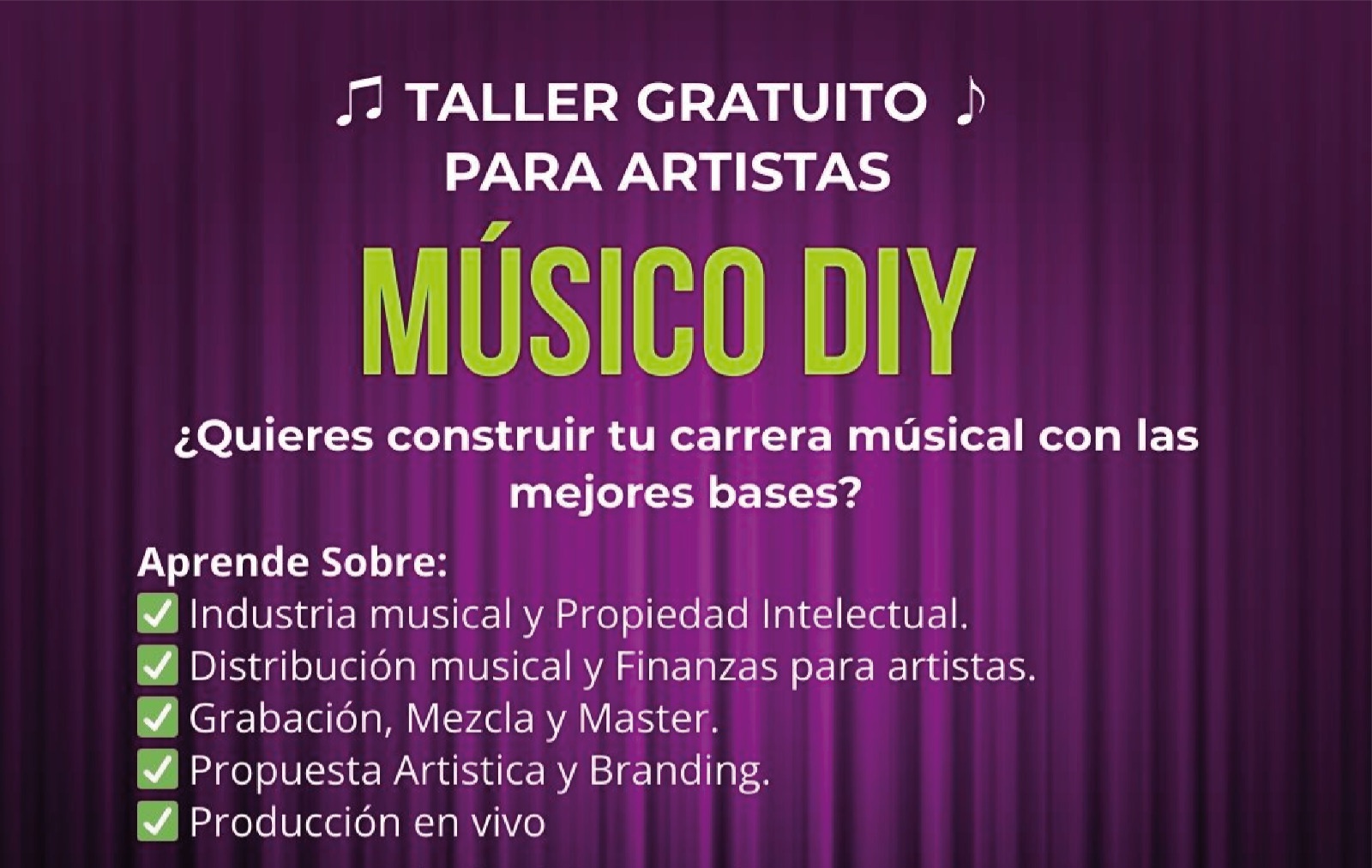 Este programa busca empoderar a los músicos locales, brindándoles conocimientos que les permitan profesionalizar su trabajo, mejorar su proyección y aprovechar las oportunidades que ofrece el entorno digital y escénico actual.