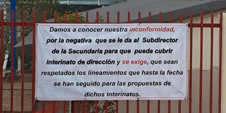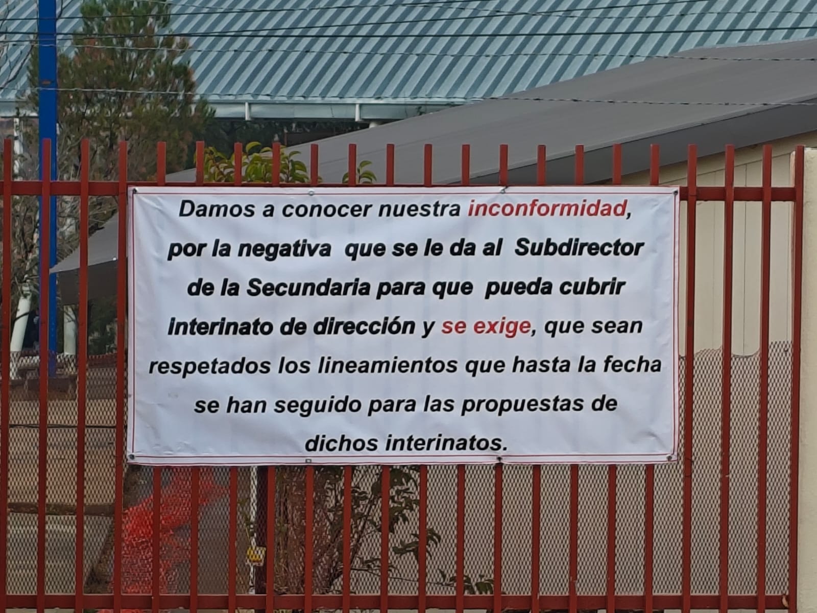 Como parte de las acciones de protesta, fue colocada una lona en el barandal de la escuela, en la que se hace pública la exigencia de que se respeten los lineamientos utilizados hasta ahora para la propuesta de interinatos de dirección, así como el rechazo a la negativa emitida por la autoridad educativa.