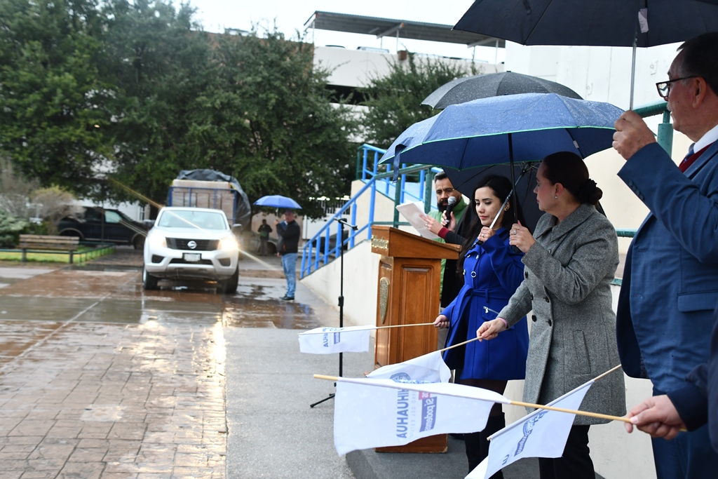 El banderazo de arranque para la distribución del equipamiento se efectuó en la Plaza de la Revolución, a un costado del Edificio Héroes de la Revolución, y estuvo a cargo de la titular de la SEyD, Sandra Elena Gutiérrez Fierro, y el director general del SPAyT, Socorro Olivas Loya.