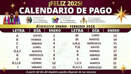 El depósito de las pensiones Bienestar se realizará según la inicial del primer apellido de los beneficiarios, de acuerdo con el siguiente calendario: