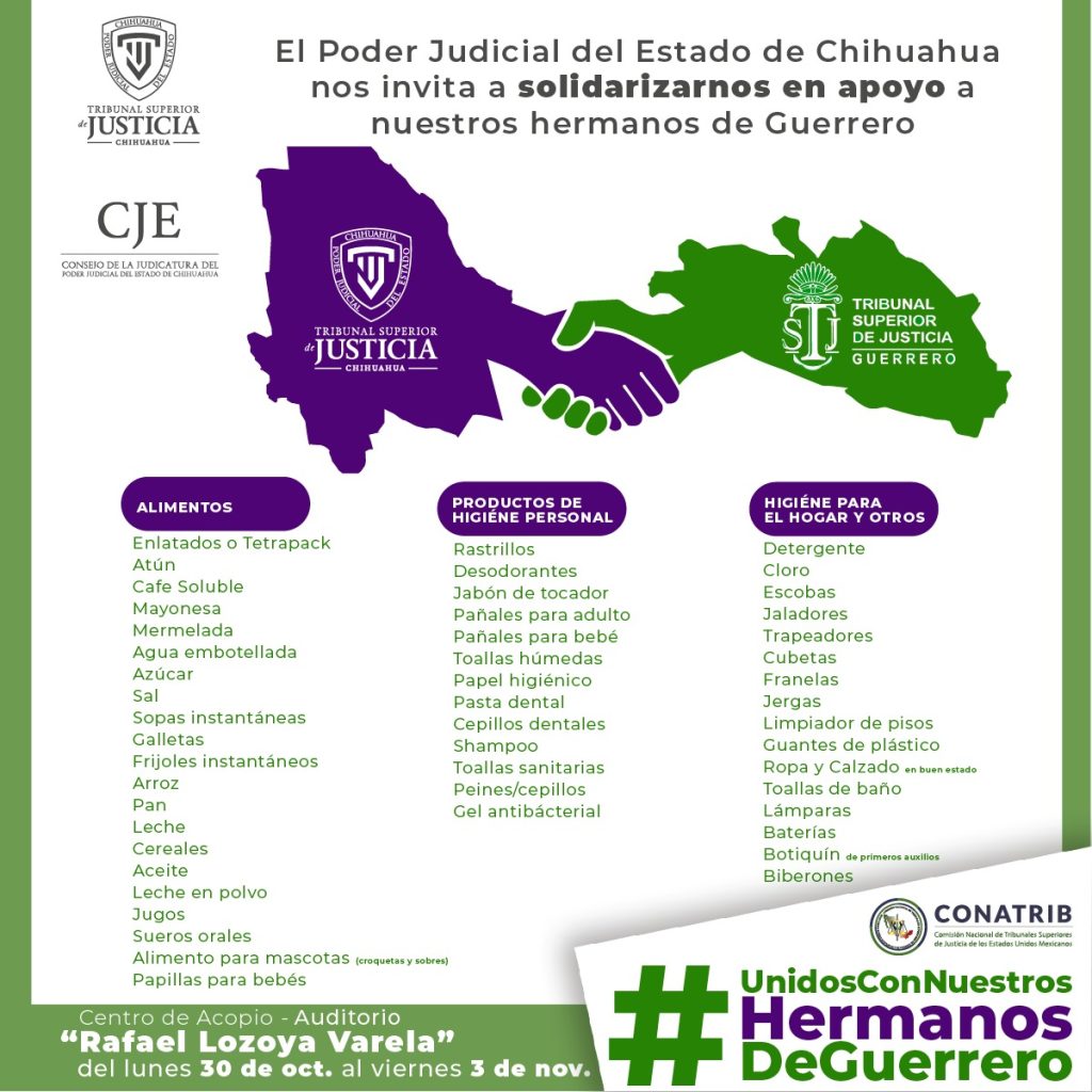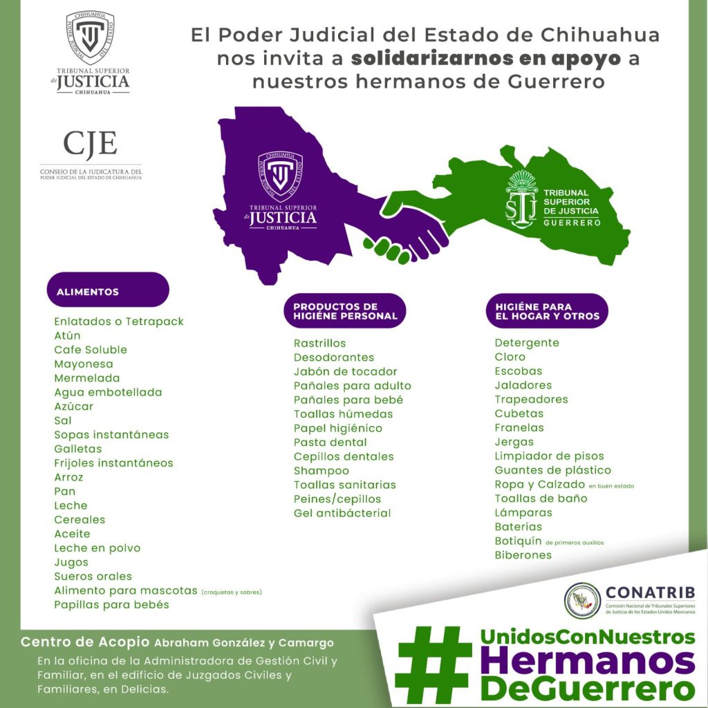 La presidenta del Poder Judicial del Estado de Chihuahua, magistrada Myriam Victoria Hernández Acosta, informó que se ha instalado en centro de acopio en apoyo de las y los damnificados por el paso del huracán Otis que dejó efectos devastadores en el estado de Guerrero.