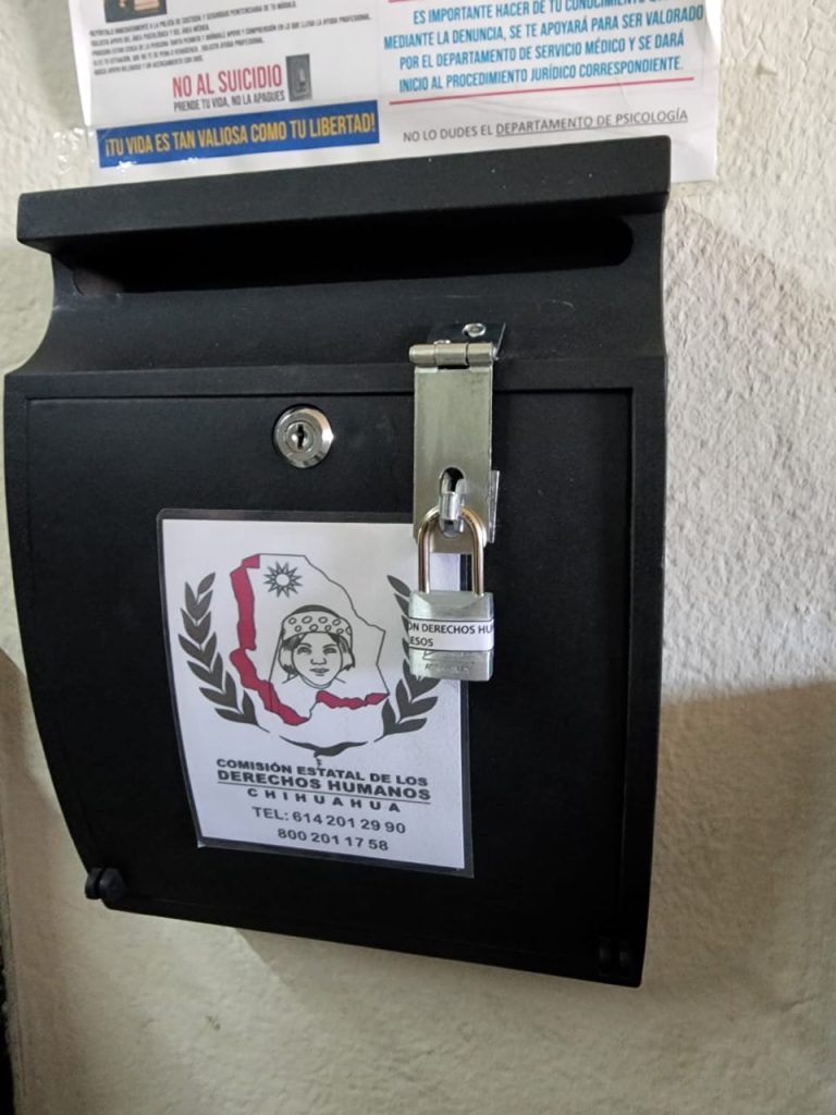 Con la finalidad de promover y fortalecer acciones que garanticen el respeto a los Derechos Humanos de las personas privadas de la libertad en los once Centros de Reinserción Social, el Sistema Penitenciario de Chihuahua en coordinación con la Comisión Estatal de los Derechos Humanos, instalaron buzones para depositar inconformidades, las cuales serán de conocimiento exclusivo del personal de la CEDH.