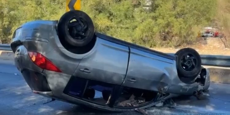 La irresponsabilidad de un conductor que invadió el carril contrario de circulación, provocó la volcadura de un automóvil cerca del Vado de Duraplay.
