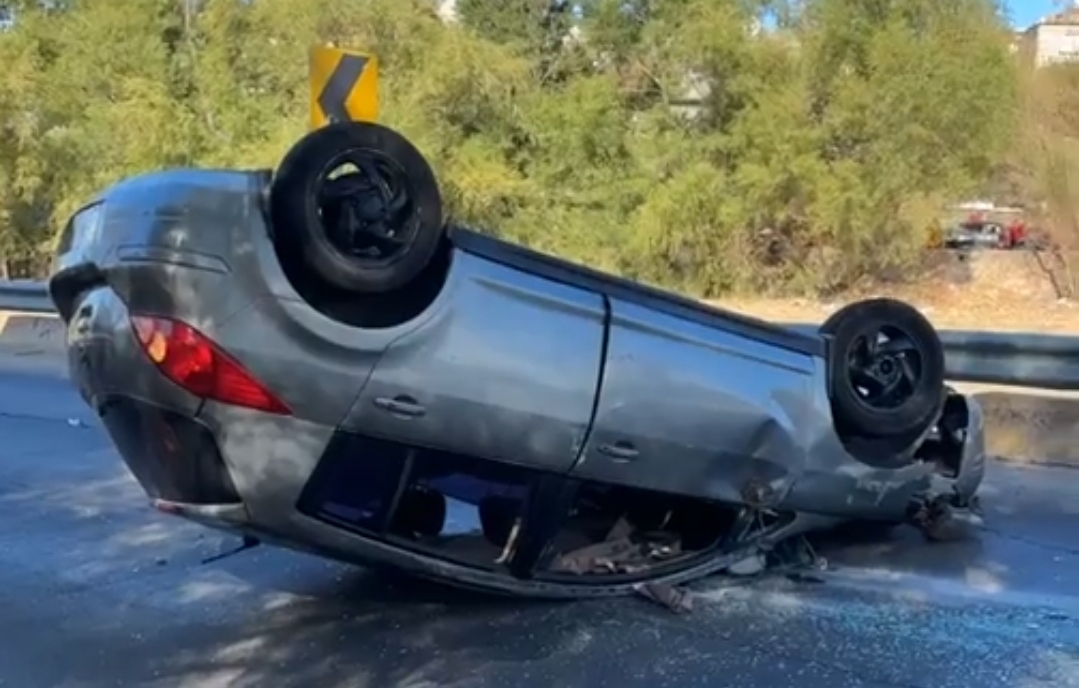 Al llegar las autoridades viales y cuerpos de rescate a ese punto de la Vialidad del Río, localizaron un auto Nissan de cuatro puertas, color gris, con las llantas hacia arriba y con daños en carrocería, mecánicos y vidrios.