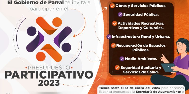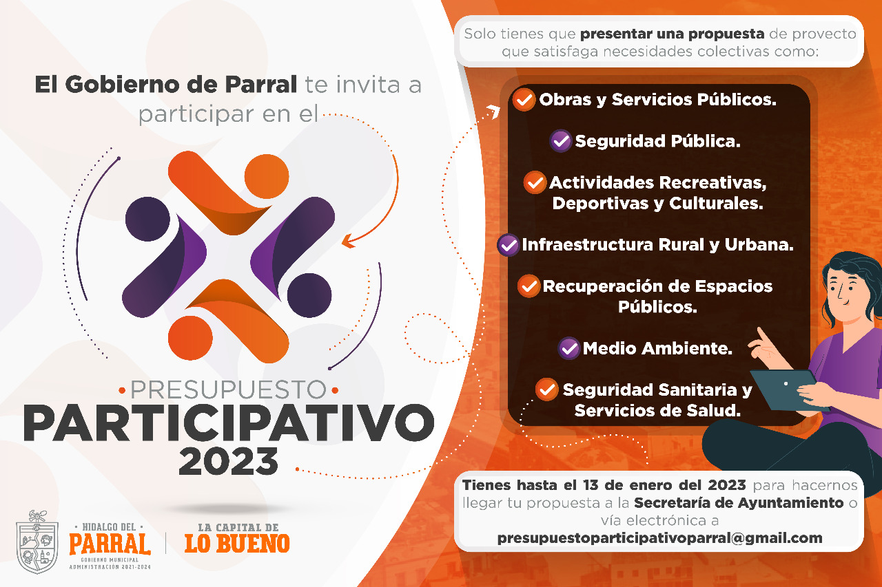 Dijo que todos los parralenses tienen la oportunidad de participar con propuestas en materia de obras y servicios públicos, seguridad pública, actividades recreativas, deportivas y culturales, infraestructura rural y urbana, recuperación de espacios públicos, medio ambiente, seguridad sanitaria y servicios de salud, teniendo como fecha límite de entrega el 13 de enero de 2023.