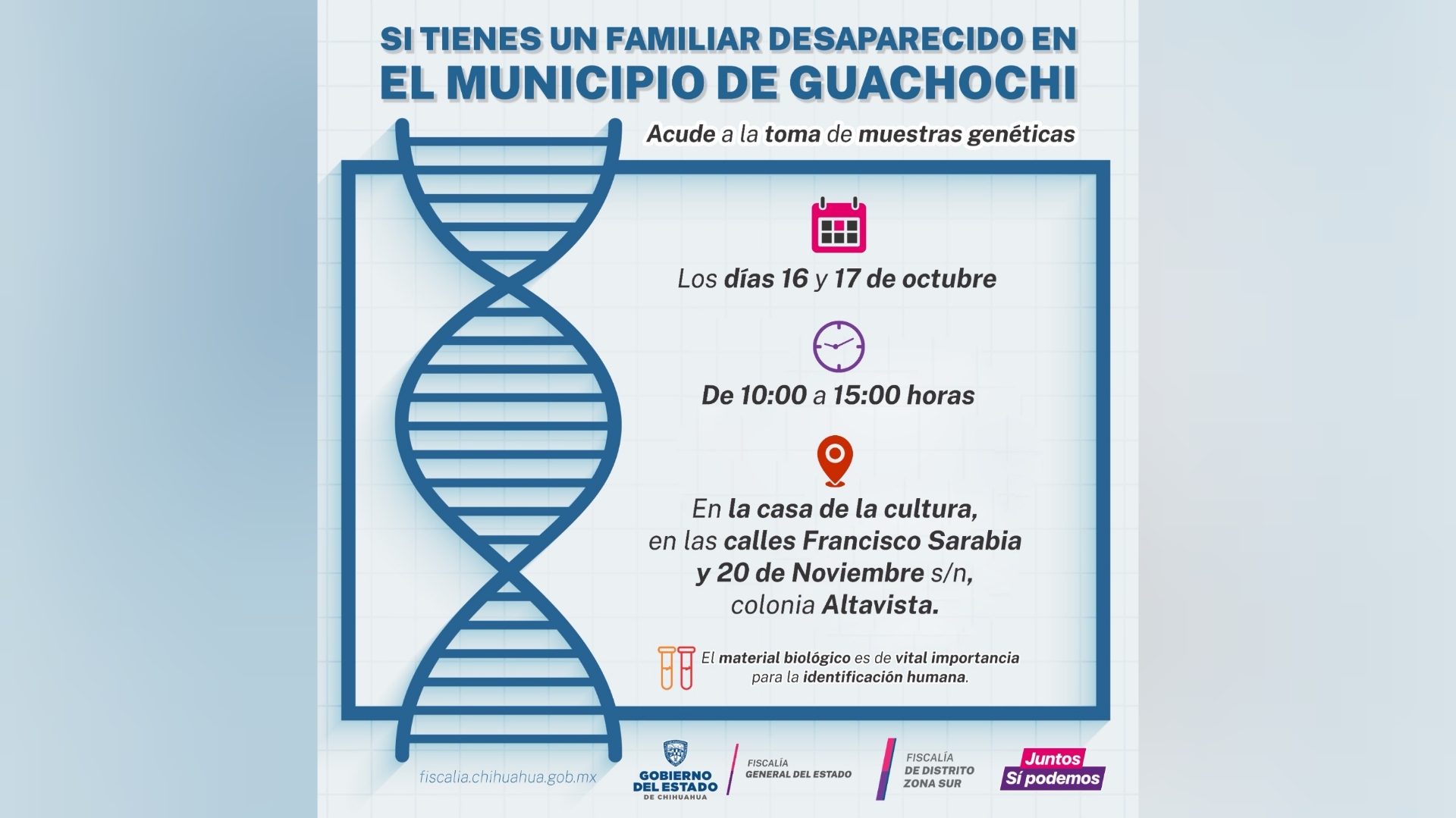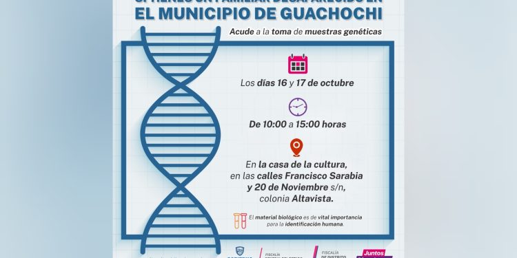En continuidad con los trabajos de búsqueda de personas, la Fiscalía de Distrito Zona Sur llevará a cabo la toma de muestras genéticas a familiares de personas que se encuentren desaparecidas en el municipio de Guachochi, a fin obtener perfiles que permitan ser cotejados como parte de las investigaciones y protocolos de identificación.