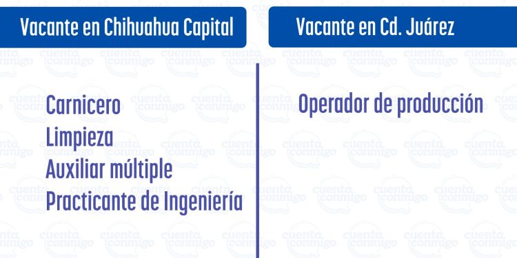Rafael Loera, titular de la dependencia, informó que en la ciudad de Chihuahua cuentan con varias oportunidades, entre las que se encuentran el puesto de carnicero, personal de limpieza, auxiliares múltiples y practicantes de ingeniería. En Ciudad Juárez actualmente existen vacantes para operadores de producción.