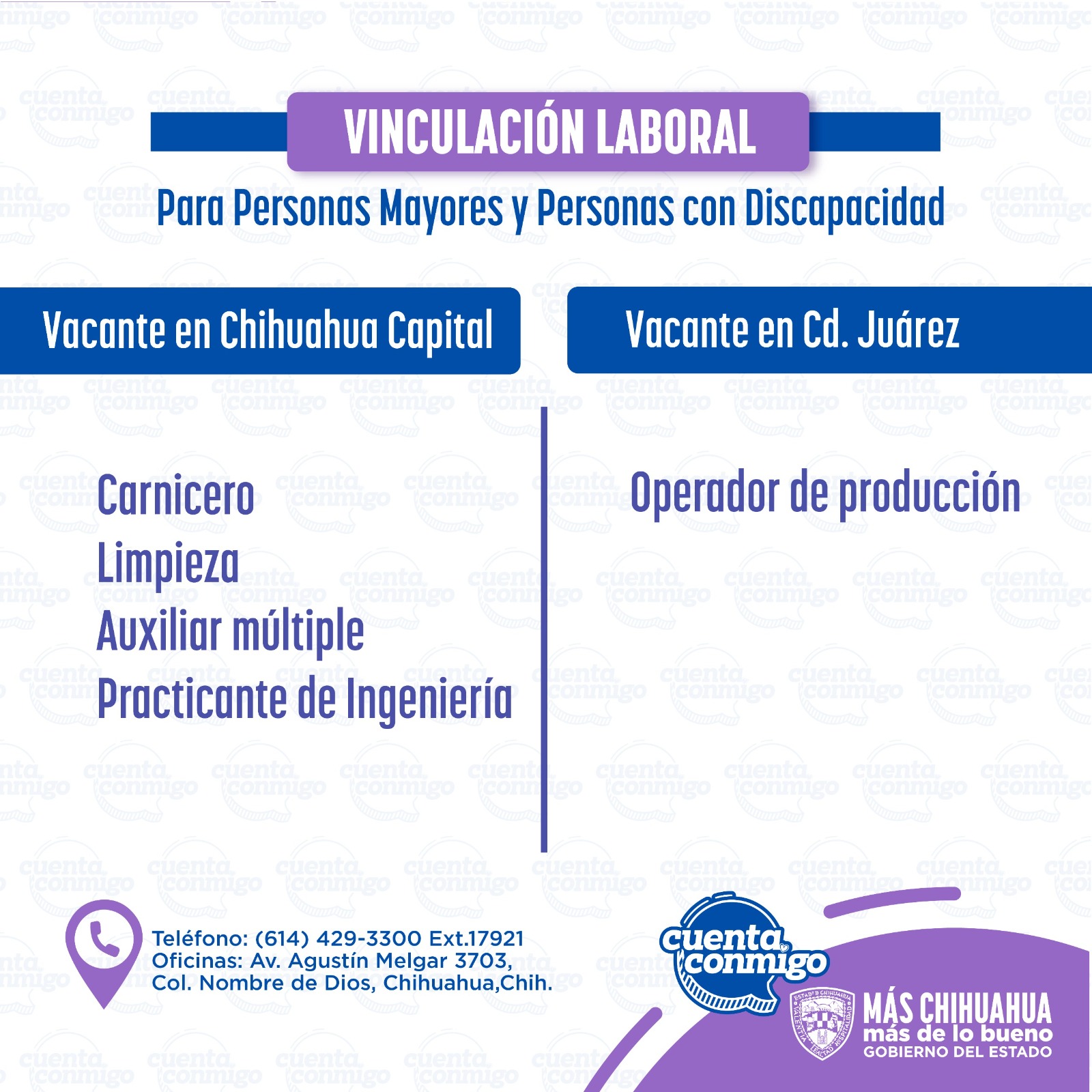 Las personas que deseen obtener mayor información sobre los requisitos y prestaciones de cada una de las vacantes, se pueden comunicar al teléfono (614) 429-33-00, extensiones 17902 o 17904.