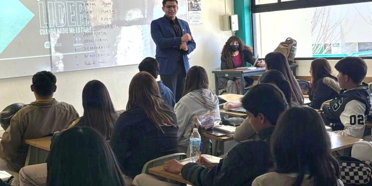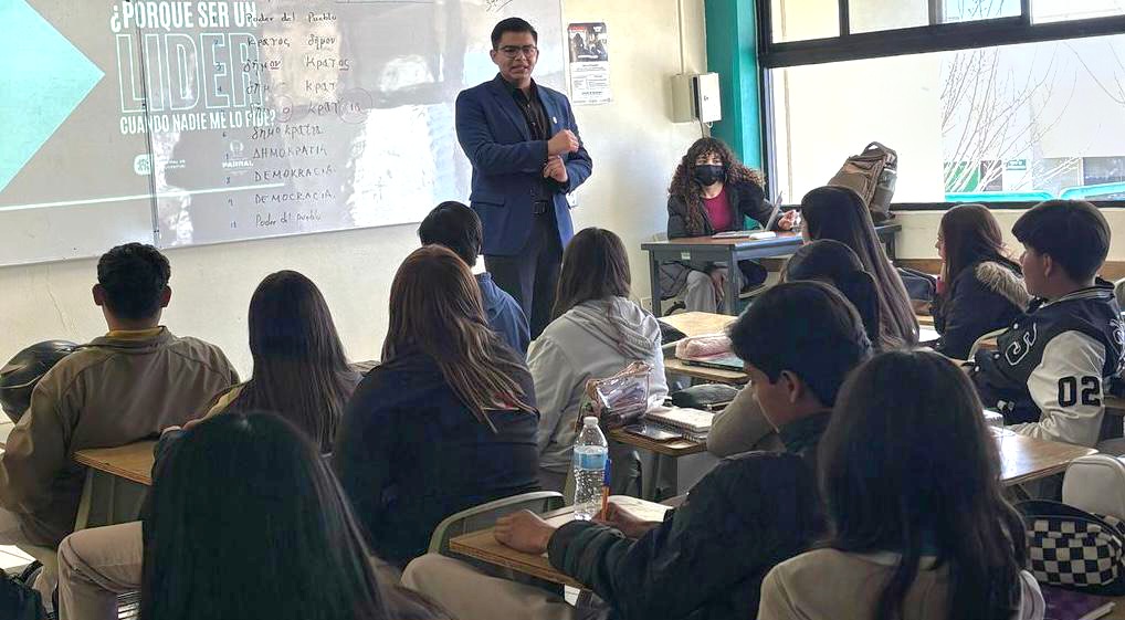 Promueve el director del Instituto Municipal de la Juventud (IMJUVE) pláticas sobre liderazgo y participación de las juventudes en el Colegio de Bachilleres plantel 12, como parte fundamental en la conformación de las políticas públicas.