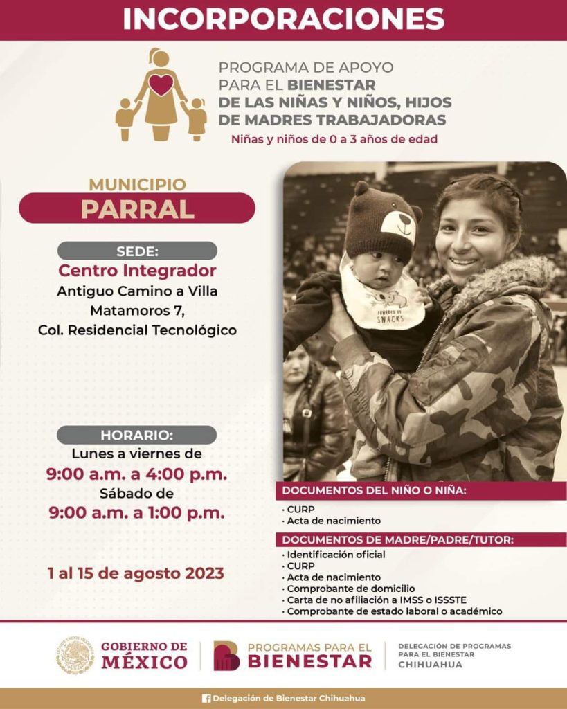 El subdelegado de la Secretaría del Bienestar para la zona sur del Estado, Fernando Duarte González, invitó a quienes viven en Parral, estudian o trabajan y tienen hijos de 0 a 3 años, a inscribirse en el Programa de Apoyo para el Bienestar de Niñas y Niños, Hijos de Madres Trabajadoras, consistente en un apoyo económico bimestral.