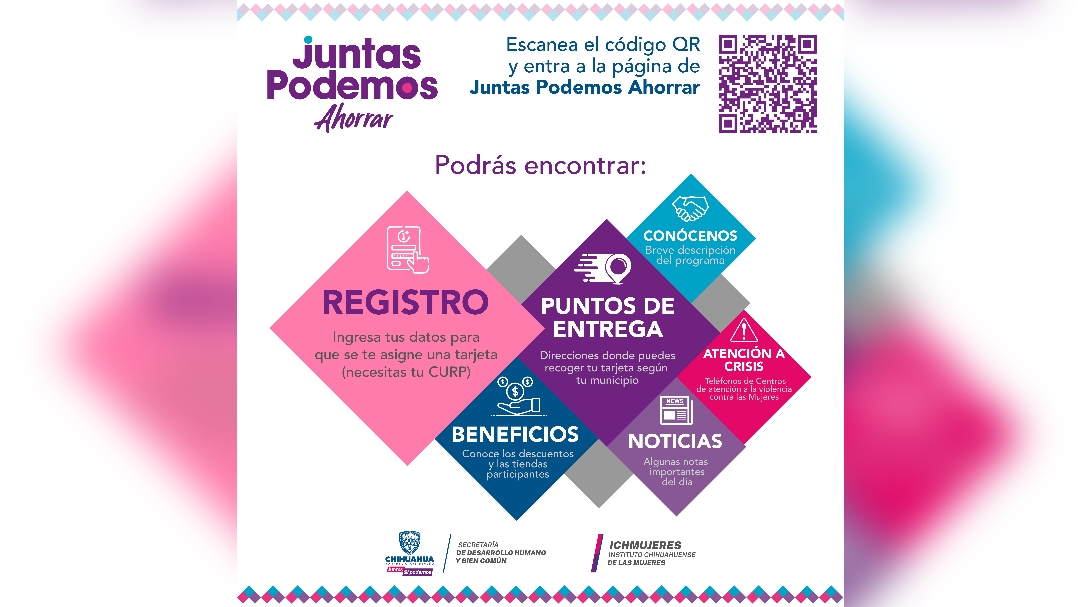 Para registrarse escanear el código QR y acceder a la página Juntas Podemos Ahorrar entrar a la página: https://registrojpa.institutochihuahuensedelasmujeres.gob.mx/, solo se requieren datos de la Clave Única de Registro de Población (CURP) y para recogerla deberán presentar identificación oficial.