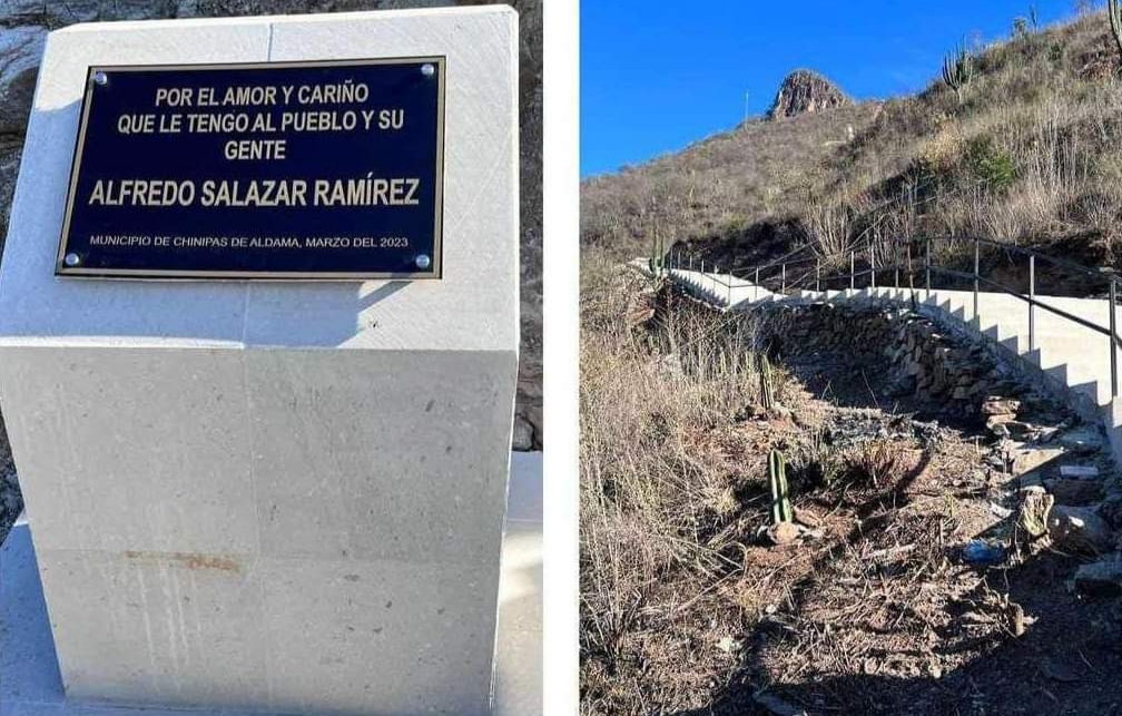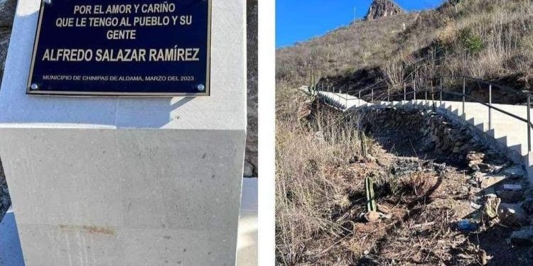 Se trata de la llamada escalera más grande de México, misma que nadie sabe -o no quieren decir- en qué momento se construyó ni de dónde salieron los recursos, a pesar de que está «sellada» con una placa que dice: ‘Por el amor y el cariño que le tengo al pueblo’, frase «firmada» por uno de los lideres del grupo criminal Los Salazar, que fueron jefes de José Noriel Portillo, asesino de dos sacerdotes jesuitas en Cerocahui, cuyo cuerpo fue encontrado ejecutado en Choix, Sinaloa.