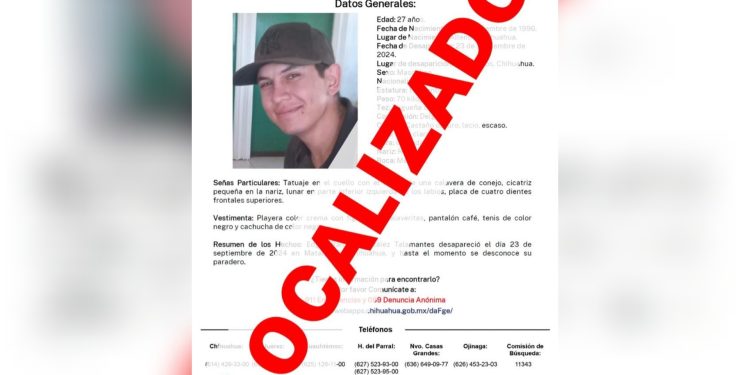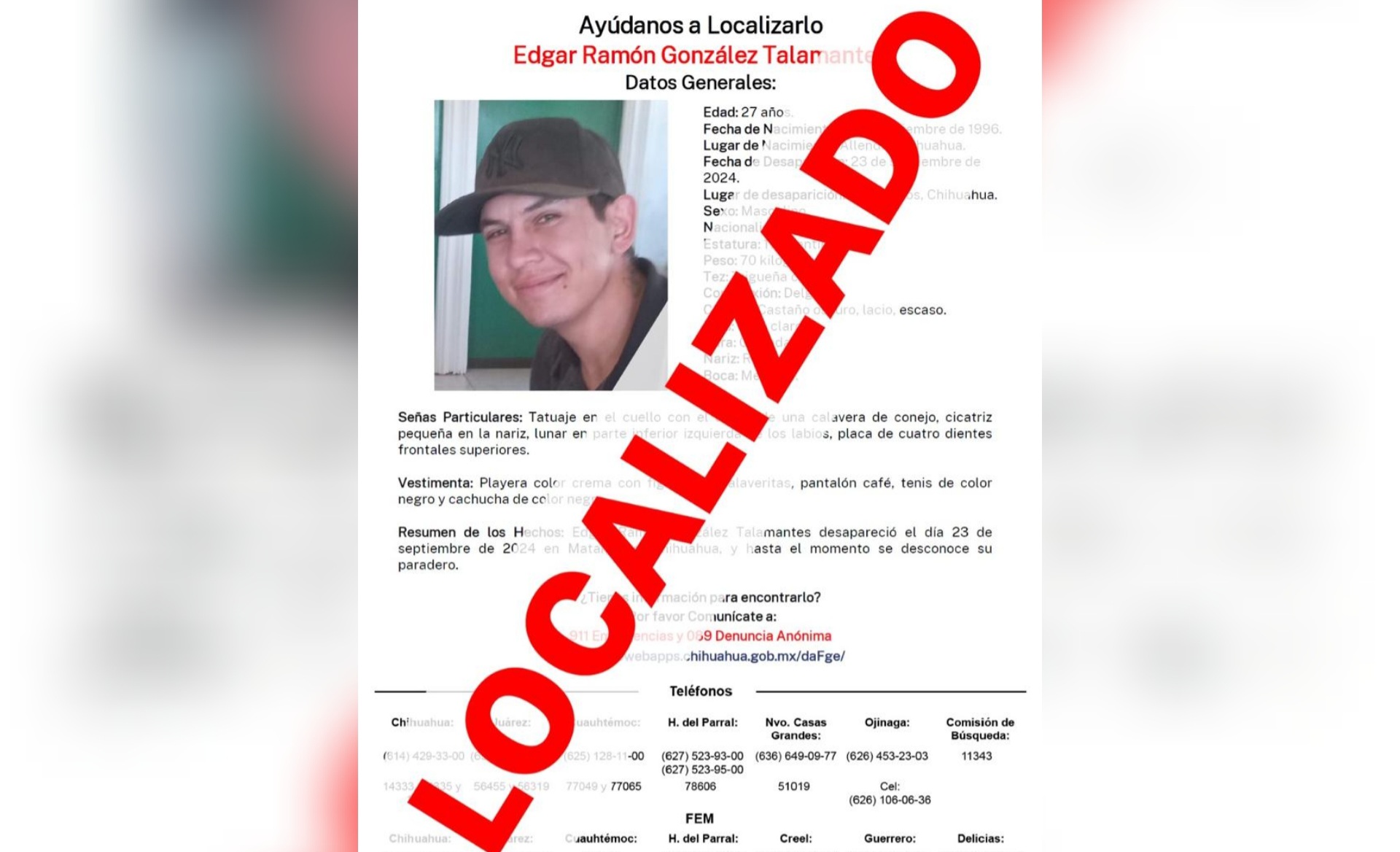La implementación de los protocolos de búsqueda, permitió que elementos de la Agencia Estatal de Investigación (AEI) localizaron a dicha persona de nombre Edgar Ramón G. T., este sábado en el municipio de Matamoros.