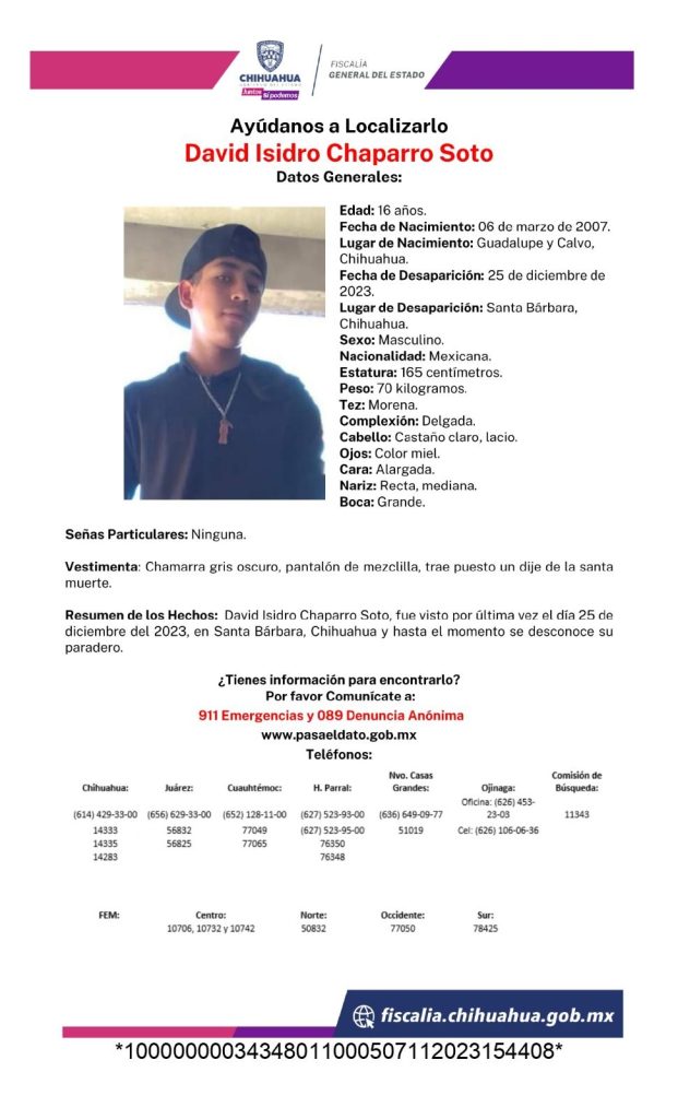 David Isidro Chaparro Soto fue visto por última vez el 25 de diciembre del 2023 en Santa Bárbara, Chihuahua, y hasta el momento se desconoce su paradero, detallaron en la ficha de búsqueda.