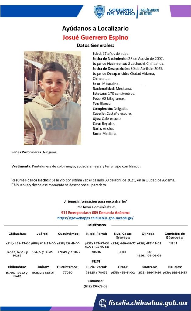 La Fiscalía General del Estado lanzó una pesquisa para localizar a Josué Guerrero Espino, un joven de 17 años que fue visto por última vez el pasado 30 de abril de 2025, en Ciudad Aldama, Chihuahua. Desde entonces, no se ha tenido noticia sobre su paradero.