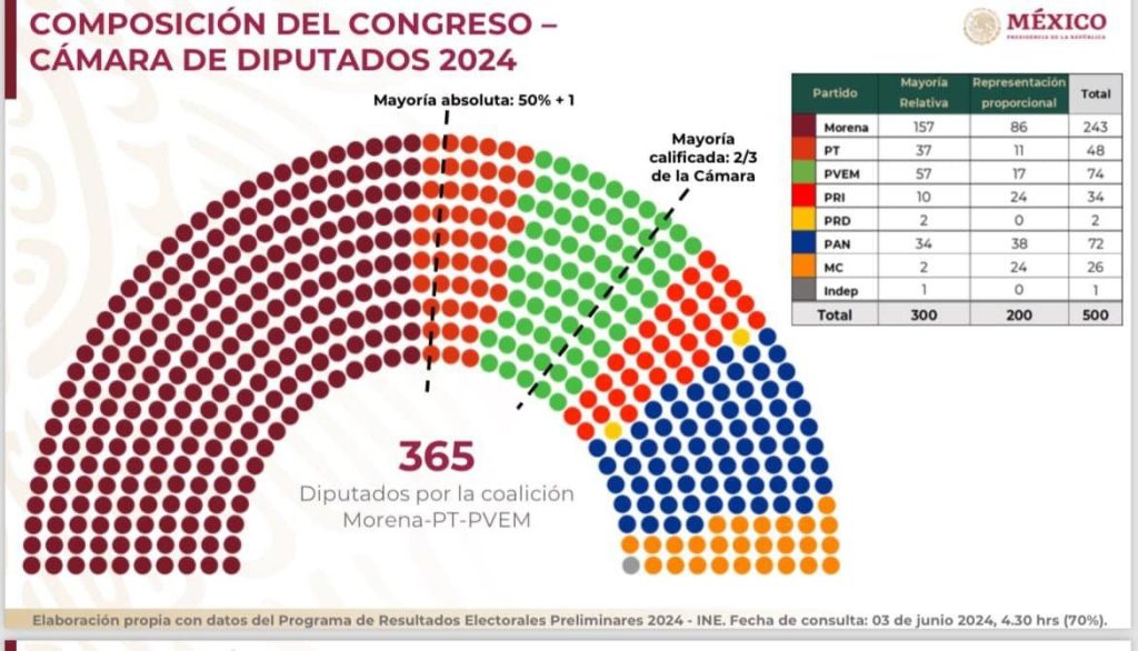 En la Cámara de Diputados, las futuras bancadas de Morena, Partido Verde (PVEM) y Partido del Trabajo (PT) contarán con 243 curules, 74 y 48, respectivamente, un total de 365 representantes, 31 más de los requeridos para conformar la mayoría calificada, lo que les da paso libre para modificar la Constitución y concretar las reformas contenidas en el llamado plan C.