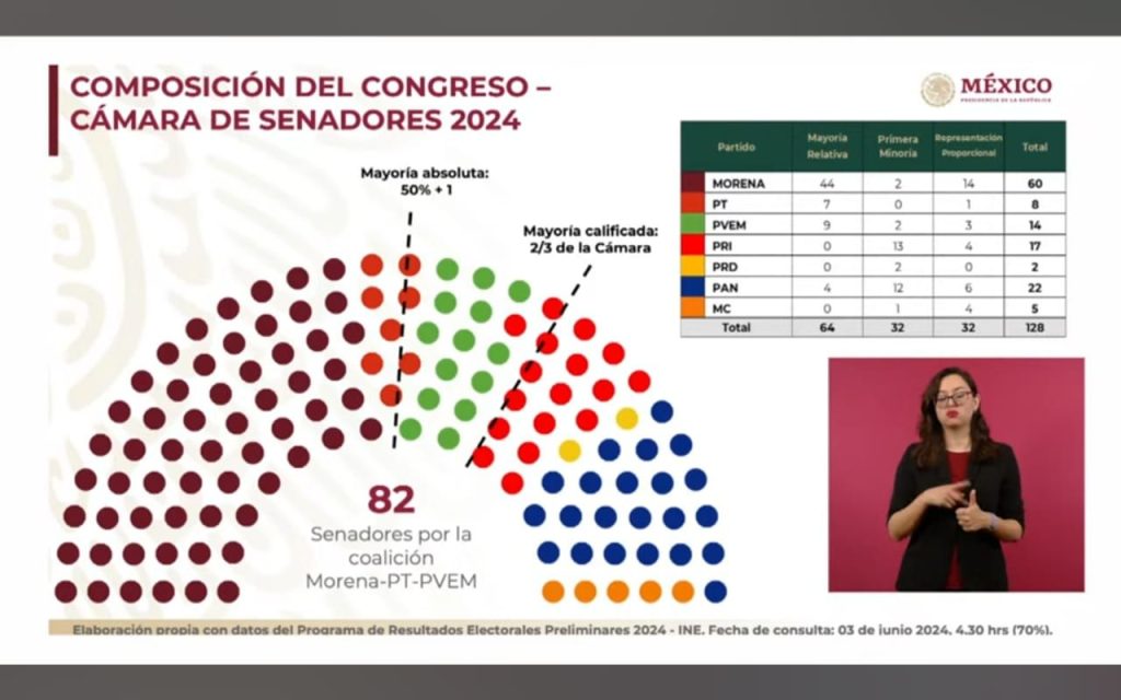 En tanto, en el Senado, si bien el conteo rápido le daba la mayoría calificada a Morena y sus aliados, el PREP arrojó que se quedarán con 82 escaños, cuatro menos de la mayoría calificada, por lo que tendrían que negociar con alguna minoría para lograr la aprobación de reformas constitucionales.