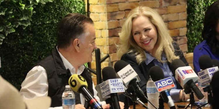 Mario Vázquez, acompañado de Daniela Álvarez, presentó este lunes en Ciudad Juárez a su suplente en la candidatura al Senado, la empresaria y exdiputada priista, Adriana Fuentes.