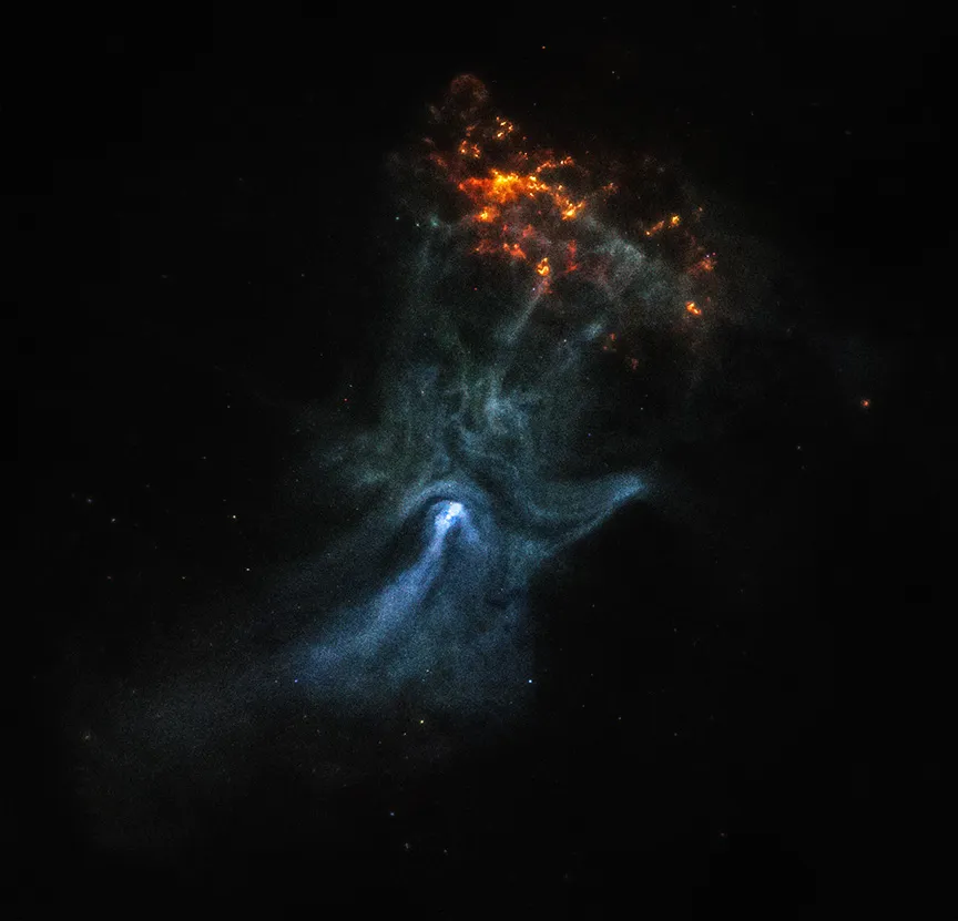 Los púlsares jóvenes pueden crear chorros de materia y antimateria que se alejan de los polos del púlsar, junto con un intenso viento, formando una «nebulosa de viento de púlsar«. Es lo que vemos en la foto de la NASA con forma de mano fantasmal: