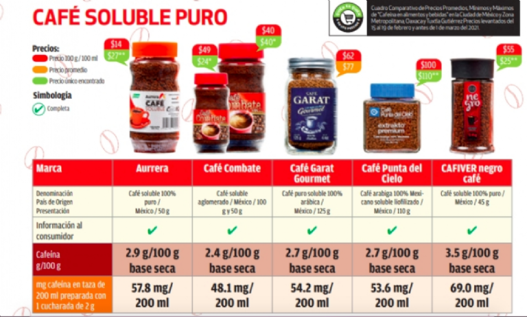 En cuanto al estudio de la Profeco con los cafés solubles, denotan tres marcas por su bajo precio que va desde los 27 a los 77 pesos en presentaciones de 50 a 125 gramos, según el supermercado donde se adquieran.