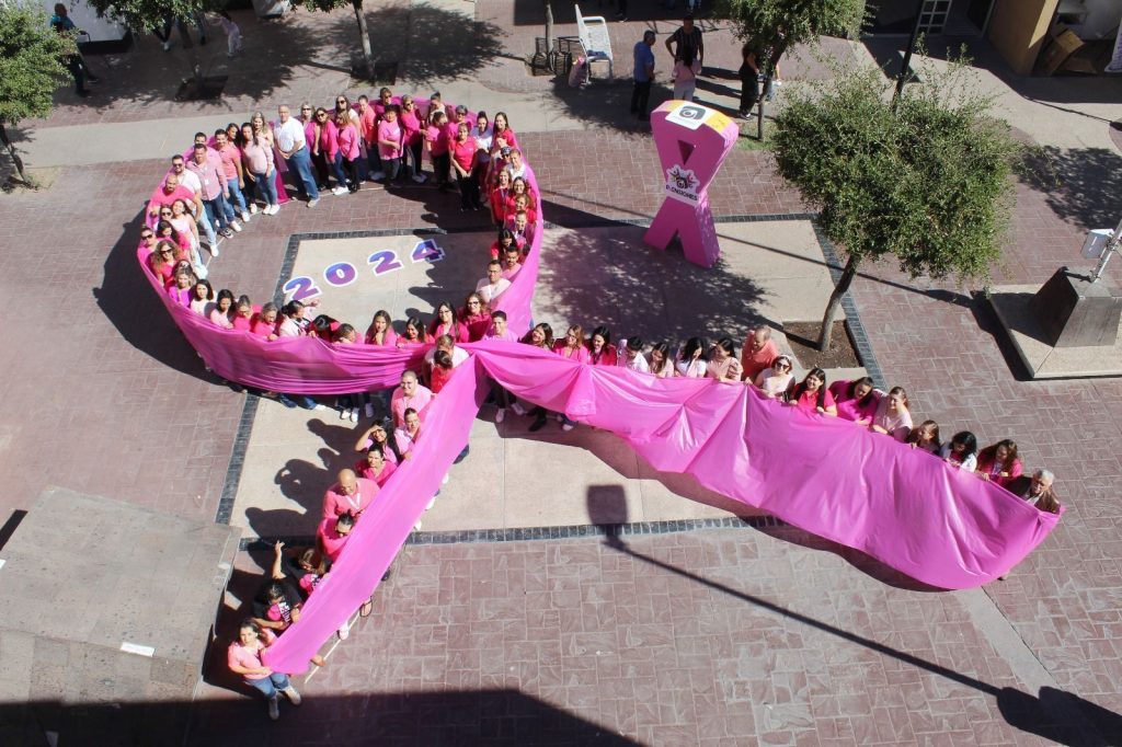 Con el fin de concientizar y sensibilizar a la población derechohabiente sobre la lucha contra el cáncer de mama, personal de Pensiones Civiles del Estado (PCE) se unió para crear un lazo humano rosa como símbolo de unidad y compromiso.