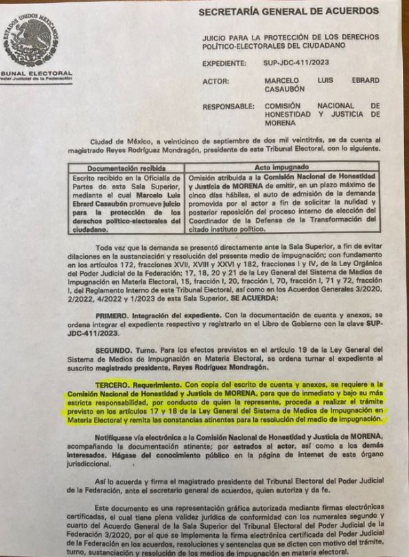 Luego de que Marcelo Ebrard, presentó un juicio contra la Comisión de Honor y Justicia de Morena, ante la Sala Superior del Tribunal Electoral del Poder Judicial de la Federación (TEPJF), la autoridad le dio la razón y le ordenó al partido guinda responda a la impugnación que presentó el pasado 10 de septiembre.