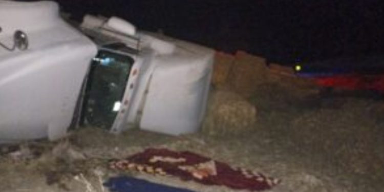 Un tráiler cargado de alfalfa se volcó en la carretera a Jiménez, a la altura del entronque al ejido Guillermo Baca, cuyo saldo es de dos personas heridas.