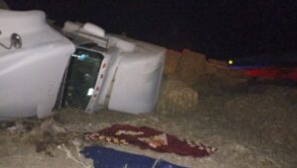 Un tráiler cargado de alfalfa se volcó en la carretera a Jiménez, a la altura del entronque al ejido Guillermo Baca, cuyo saldo es de dos personas heridas.